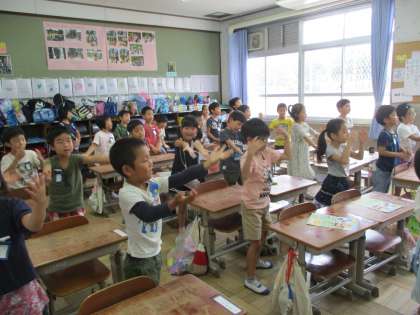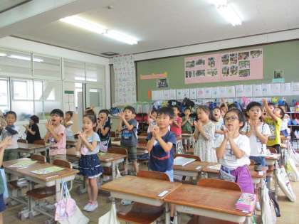 朝の会で「パプリカ」を歌ったり踊ったりしています。4月当初は,この曲を知っている子たちで盛り上がっていましたが,歌い始めて4か月近く経つと,みんなが笑顔で楽しそうに歌ったり踊ったりするようになりました。覗くような振付けの時には,「はい,ひょっこりはん!」などと冗談を言いながら,楽しく踊り,ニコニコで1時間目を迎えています。
