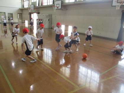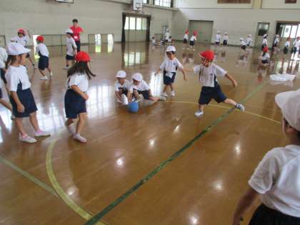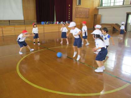体育科では,水遊びと並行してボール遊びも行っています。雨が続き,外で学習できないので,体育館で1・2組合同で体育館の床の円を利用して,ころがしドッジボールを行いました。ころがす人もよける人も,時間が経つにつれてどのようにすれば相手を当てたりボールに当たらずに残れるかを考え,機敏に動けるようになっていました。