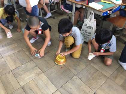 理科で「ゴムを使った実験」をしていましたが、今日は図工で「ゴムを使ったおもちゃ」を作りました。紙コップの口に切り込みを入れ,中に輪ゴムをはさみます。その輪ゴムに粘土で作った球体をくっつけて回る軸を作ります。作った仕組みを後ろに引くと、「ころころころ」とかわいい動きをします。