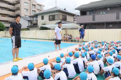 もうすぐ夏休みです。川や海などで水遊びをすることもあると思います。しかし,自然ではいつ何が起こるのかわかりません。川や海で遊んでいる時にもしも流されてしまったら...。そんな時に備えて消防署の方に来ていただき,流された時にどうすればよいのかを教えていただきました。実際に服を着て,普段とは違う泳ぎにくさに気づいたり,ペットボトルを使って実際に浮いてみたりしました。子どもたちは,楽しみながらも真剣な表情で学んでいました。