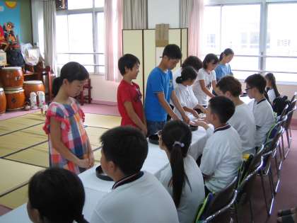 今日は中国から30名ほどのお客さんが来校されました。そのほとんどは中国の小学生で,日本にはお茶の文化の学習で来られているそうです。その学習の一つとして,砂川小学校の「お茶の会」で茶道体験をしていただきました。
