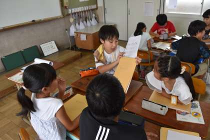 今回の単元ではゴールの活動として「Who is this?」というクイズ形式の活動をしました。お互い有名人やキャラクターを答えに,様々にヒントの文をつくりました。単語の並びや,語と語のスペースに気をつけながらつくりあげました。クイズの活動は大盛り上がりでした。