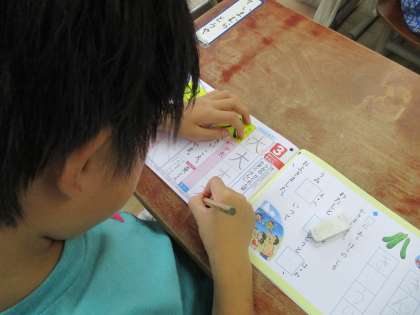 漢字の練習では,漢字ドリルを使って丁寧に練習をしました。はらいに気を付けて,みんな丁寧に書くことができました。