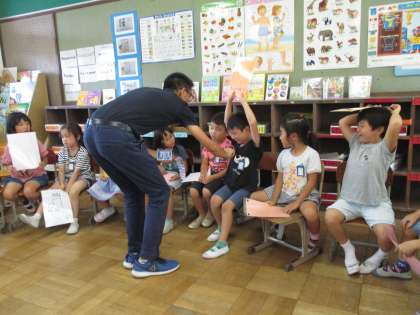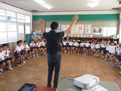 9月11日,1年生は初めての外国語活動を行ないました。担任の先生とだけでなく,島本先生とアリオーラ先生と一緒に楽しく学習しました。しかも,「イングリッシュルーム」という,特別な教室で学習したので,はじめは緊張していたみんなでしたが,すぐに慣れ,笑顔で元気いっぱい活動しました。今日は,あいさつの仕方や気持ちの表し方を勉強しました。アリオーラ先生にご褒美のシールをもらって,ニコニコ笑顔のみんなでした。
