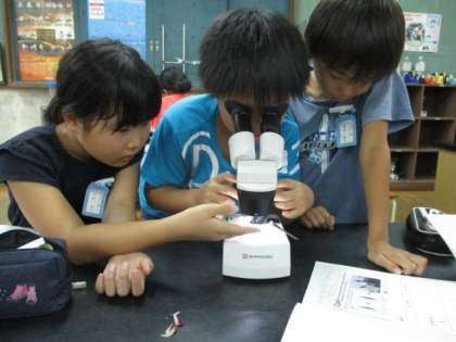 理科の授業では,「植物の実や種子のでき方」について学習しています。今日は,顕微鏡を使って実際にめしべとおしべを観察しました。