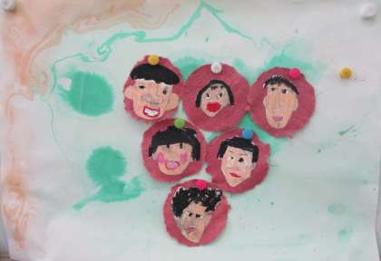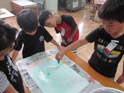 指先に力を入れて和紙をちぎり,ぶどうを作りました。