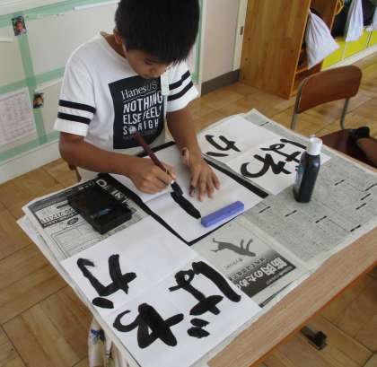 合同運動会のかんばんの字を筆で書くことにしました。
