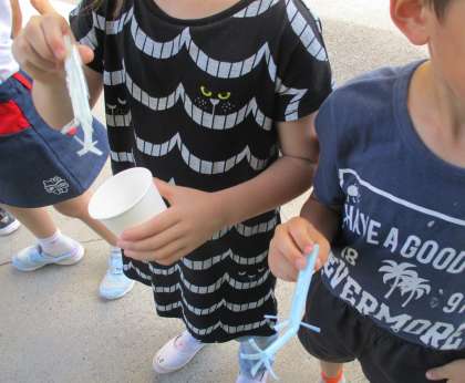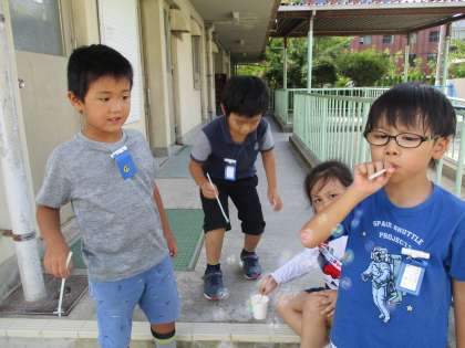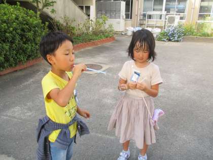 生活科の学習で,シャボン玉遊びをしました。色々な工夫をして,シャボン玉遊びを楽しみました。大きなシャボン玉を作るために,ゆっくり息を吐いたり,小さなシャボン玉をたくさん作るために,ストローを切って何本も合わせたり,ストローの先を少しずつ切ってタコの足のようにしたりと,子どもたちはそれぞれ思い思いのやり方で,シャボン玉遊びを楽しんでいました。