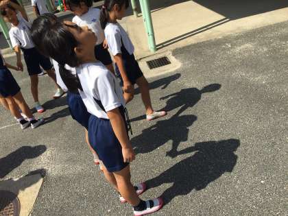 国語で「ちいちゃんのかげおくり」の学習をしています。ちいちゃんが家族で一緒にやったかげおくりをクラスのみんなで体験してみました。昨日はよく晴れた日で,かげおくりがよくできそうな空でした。「ひとおつ,ふたあつ,みっつ・・・・」とみんなで数えてドキドキしながらやりました。本当にかげおくりができることを知ってみんな大喜び。「先生,できたよ。」と嬉しそうに教えてくれました。ハート型のかげおくり,両手をつないだかげおくり,色々な形のかげを空におくりました。少しでもちいちゃんの気持ちに寄り添えたかなと思います。