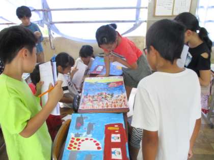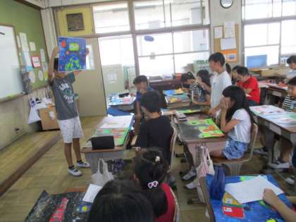 お話の絵が完成し,みんなで作品を鑑賞しました。今回は,むらなく塗ること,思いをもって塗ることなど丁寧に色塗りをすることを意識して最後まで作品を仕上げました。自分の作品との違いや,友達の工夫に気づきみんなで良さを認め合いました。