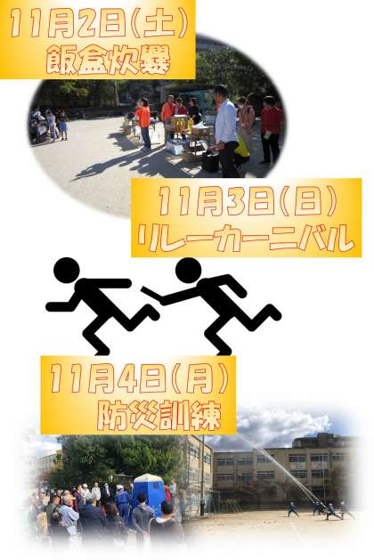 さて,11月に入ってすぐの先週末の3連休,2日(土)は飯盒炊爨,3日(日)はリレーカーニバル,4日(月)は防災訓練と,地域行事3連続!!子どもたちの参加もそれぞれにあり,天候にも恵まれ,充実の3日間でした。