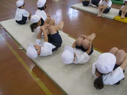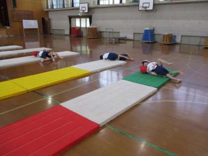 ゆりかごやエビぞりなどをしたあとは,長いマットの上を落ちないように上手に転がりました。二人組でペアになって転がる活動も行いました。一人で転がるよりも難しかったようですが,二人組で楽しそうに活動する姿がたくさん見られました。