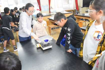 塩酸に溶けたアルミニウムは液の中にあるのかどうかを,水溶液を蒸発させて調べました。蒸発して残ったものがもとのアルミニウムと違うことに驚きながら実験を進めていました。