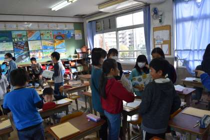 外国語では身近な地域について聞いたり答えたりすることを学習しています。自身の地域にある施設やない施設,ほしい施設について伝える活動をしています。普段よりも身近な題材なので進んで伝えることができています。