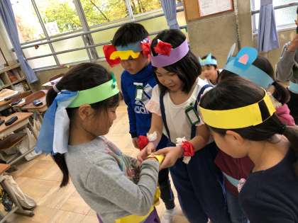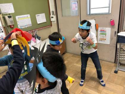 わっかからイメージして作ったものをかぶって変身しました。変身したものになりきったり,友達のおもしろいところを見合ったりしました。わくわくするような楽しい作品が出来上がってよかったです。