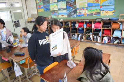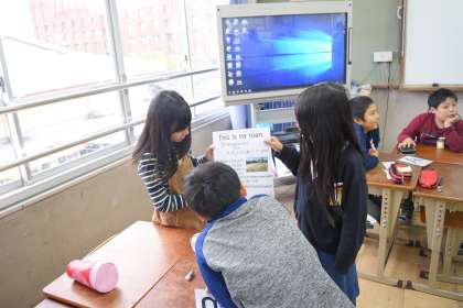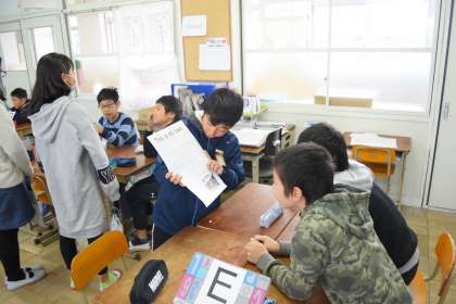 グループごとに作成したポスターを発表し合いました。自分たちの町についてある施設やほしい施設をはっきりと話していました。発表するグループが持っているポスターをみて,ここの文章なら読めるなどと文をだんだんと読めるようにもなってきました。