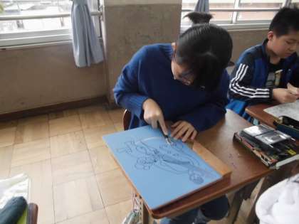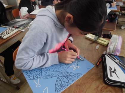 下絵ができたら,カーボン紙で板に絵を写し,彫り進めています。3年生のときから使ってきた彫刻刀。安全に気を付けて使っています。