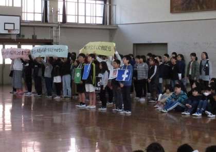 「いろんな“あいさつ”があるね」「みんなちがって,みんないい」「友だちの良いところ」「友だちと仲良くし,助け合うために」「お隣の国について」「個性って?」「SNSについて」「歴史から学んだこと」など,講話や発表を通して,人権について考える機会になりました。