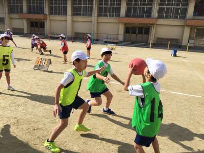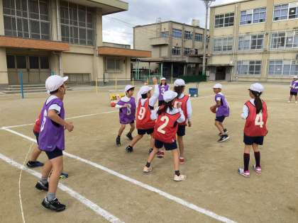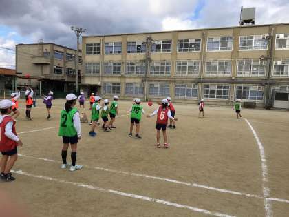 今日は体育でエンドボールをしました。初めにルールを確認して,すぐに試合をしました。2年生で学習したパスゲームとルールは似ているので子どもたちはすぐに試合の形式に慣れて楽しんでいました。パスゲームと大きく違うのは,ゴールマンとガードマンの2つの役割があることです。ゴールマンは,味方のシュートを落とさずにキャッチします。ガードマンは,相手のシュートを防ぎます。この2つの役割がとても大事になってきます。そして,コートでボールをパスしてゴールを目指す子たちはボールを上手く回しながらシュートしていました。まだまだボールを持ったらみんなが集まってくるような様子が見られます。相手のいないところに走ってボールを受けるような子もいました。これから試合を経験しながら,動き方を工夫していってほしいと思います。