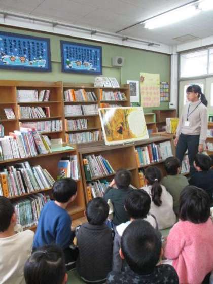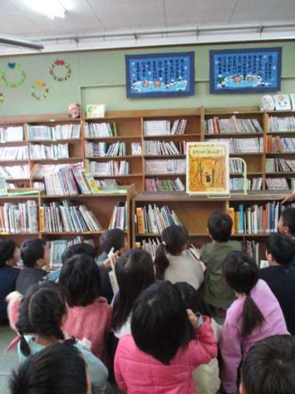 図書館へ行って,杉原先生に絵本の読み聞かせをしていただきました。今の季節にぴったりの「もりのかくれんぼう」というお話です。森の動物が出てきたり,秋の森の様子がよく伝わる絵本でした。最近,公園へ秋見つけにもいっているのでとても身近に感じたようで,とても興味津々に絵本を見ていました。これを機に,もっともっとたくさんの本に触れてほしいなと思います。