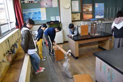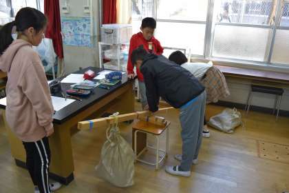 理科では,てこについて学習しています。身近にある道具にもたくさんてこの原理が使われていることに驚きもありました。実際に自分自身で原理を確認しながら進めています。