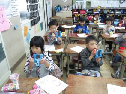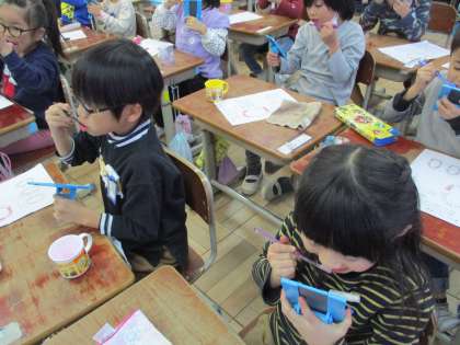 12月6日に,歯の指導がありました。養護教諭の藤本先生から,どうしたら虫歯ができるのかなどの話を聞きました。虫歯菌のえさとなる,「歯垢」がどのくらい自分の歯についているのか,歯垢染出しをしました。ピンクの錠剤を噛み噛みするみんなの顔は,なんとも言えない表情をしていました。