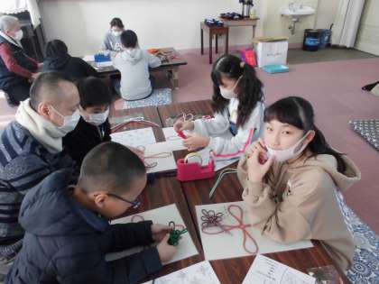 京都の伝統産業である京房ふさひも体験をしました。職人の方のお話をしっかり聞いて,意欲的に取り組んでいる6年生の姿が見られました。最後に質問をしたり,感想を伝えたりして活動がより充実したと思います。予定以上に早くできたので,難しい結び方を作品に付け加えたり,教えていただいたりすることもありました。6年生の意欲に職人の方々も感心しておられました。すてきな作品が出来上がりました。
