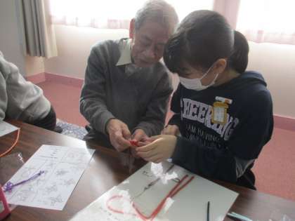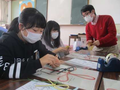 職人さんに教えていただきながら,京房ひも体験をしました。