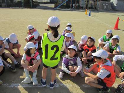ボールけりゲームでは,最初のウォーミングアップで同じチームのメンバーとパス回しの練習をしています。80回続いた!というグループもあり,どんどんうまくなっているようです。また,試合の前には作戦を考えています。それぞれのグループで楽しく試合ができるように作戦を考えられるといいですね。