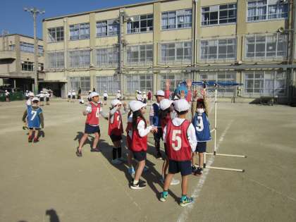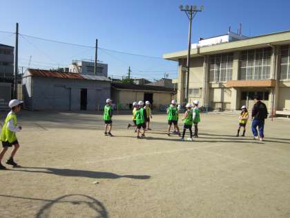 パスゲームは,ドリブルをつかずにパスを回してゴールを入れるゲームです。子どもたちはスムーズにパスを回せるように同じグループの友達と声を掛け合いながら試合をしています。どこにいたらパスをもらいやすいか考えながら試合をする子も増えてきました。
