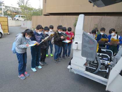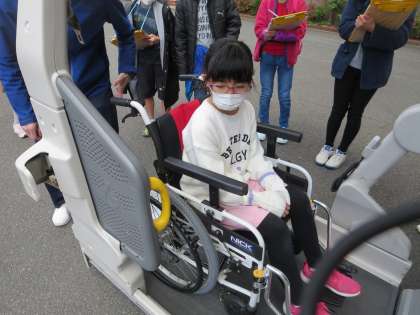 利用者さんの送迎で使われている車を見学しました。車の中は車いすで乗れる広さが確保されており,電動で上げ下げできるようになっていました。実際に車いすに乗り,車の中に入る体験をしました。