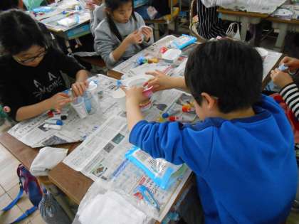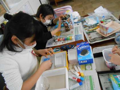 今日の図工で,空き容器をくっつけて,小物入れに紙粘土を貼っていきました。