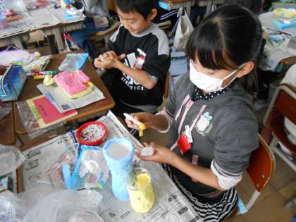 家から持って来たビーズやリボンで飾り付けをしたり,粘土で動物や目を作って付けたりして,どんどんオリジナルの小物入れになってきました。