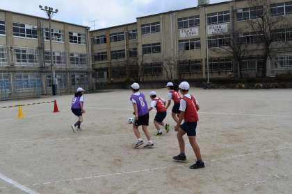 体育の学習ではサッカーをしています。どれくらいボールを蹴れるのか子どもたちはドキドキワクワクしていました。点を取るためにチームでどう動いたらよいのか,点を取られないためにどうするのかを考えながらプレーしています。自然と声をかけ合うようにもなってきました。