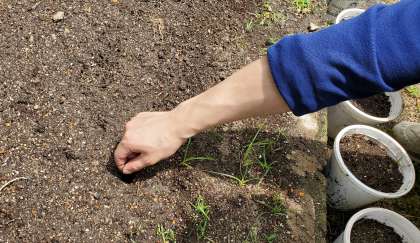 ヒマワリとオクラは,下の1つ目の写真のように,指であなをあけ,50cmくらい間をあけて,1つぶずつまきます。