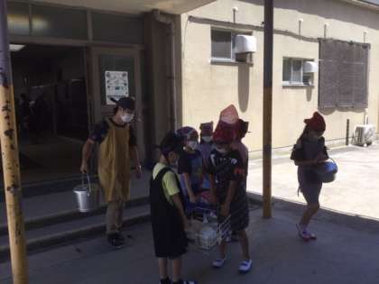 また,本校の形状の問題もあるために密を避ける観点から,給食室前で教頭先生や養護の先生に誘導してもらいながら,給食を取りに行きました。