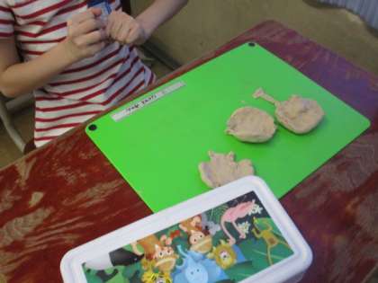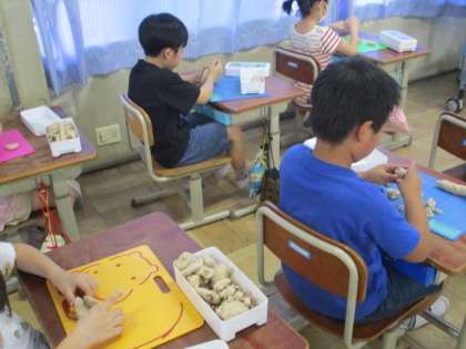図画工作科の授業では,粘土をぎゅっとにぎり何に見えるかを考え,作品を作りました。