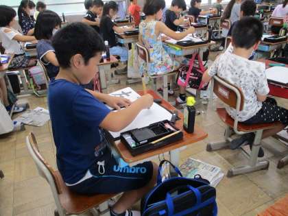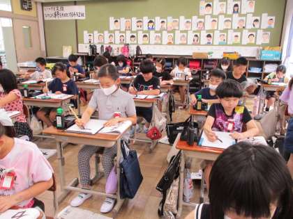 地面に両足をつけ,机と自分との間はこぶし1つ分,肩に力を入れない,等書くときの姿勢にも気をつけて書きました。