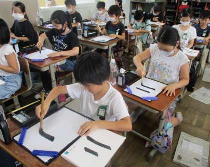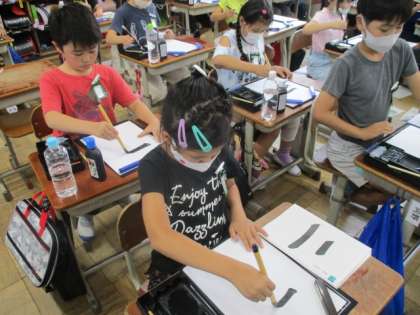 今週は,初めての毛筆の学習がありました。道具の置き方や,筆の持ち方,姿勢など,はじめの学習をしてから,「二」の文字を書きました。トン(始筆)スー(送筆)ピタ(終筆)を意識して,教室がシーンと静まった中で,集中して書いていました。学習後,「楽しかった!」「まだやりたい」とみんな毛筆に意欲を示していました。