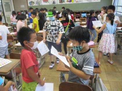 今週は,調子を尋ねたり,答えたりしました。学習の最後には,それぞれが友達にHow are you?とたずね,I'm fine.などと答えるやりとりをしました。みんな,楽しそうにどんどん尋ね合っていました。