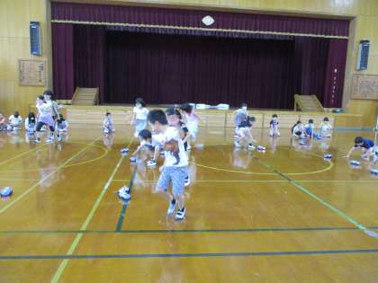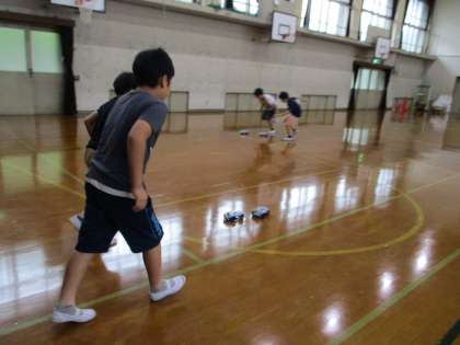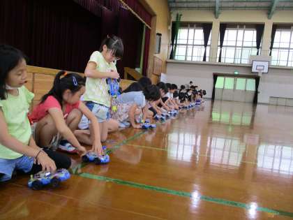 これまでに,かん電池の向きと電流の向きの関係を調べたり,かん電池のつなぎ方と,モーターの回る速さや豆電球の明るさを調べたり,かん電池のつなぎ方と電流の大きさの関係を調べたりしました。今日は電気自動車を組み立て,体育館で走らせました。思っていた以上に速く進み,子どもたちは大喜びでした。また,送風機を付けたり豆電球を付けたすると走り方が変化し,様々な気づきもありました。