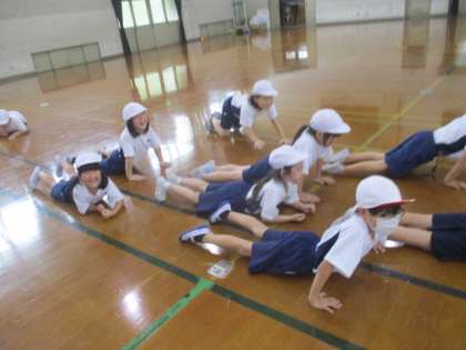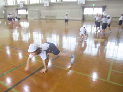 いろいろじゃんけんでは,手や足で体を支持することが大切です。みんな,しっかり体を動かすことができていました。友達との交流もたくさんあって,笑顔がたくさん見られました。授業が終わったときは,汗びっしょりの2年生でした。