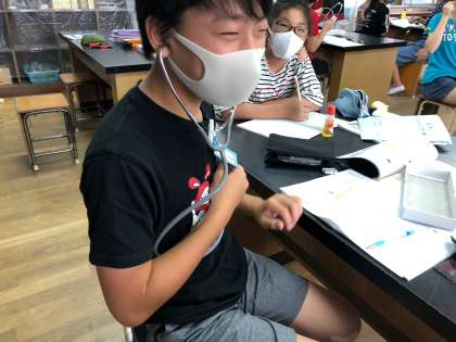 理科の学習では,体のつくりとはたらきについて学習しています。自分の脈をとったり,聴診器で心臓の音を聴いたり,とても楽しかったようです。