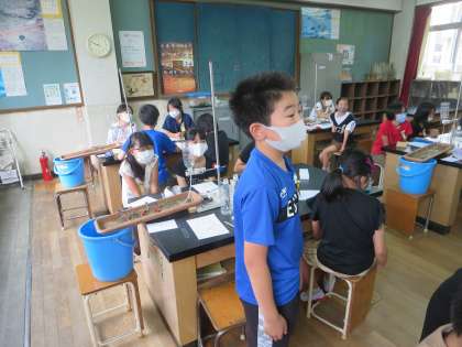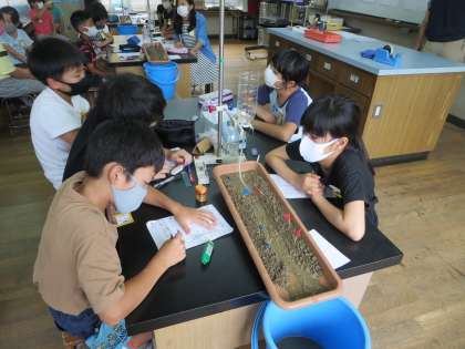 今回の理科の授業では,「流れる水にはどんなはたらきがあるだろうか」ということで,人工の川を作り流れる水の様子を観察しました。観察した結果を班でまとめ,発表し合うことができました。次はどんな実験をするのか楽しみですね。