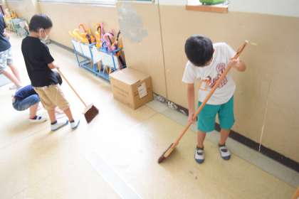 ろうかの そうじも まいにち たいへんです。