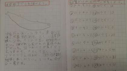 左ページには,自分の好きなことに取り組んでいます。絵と文があり1ページがきれいにまとまっています。右ページは,計算ドリルの問題に取り組んでいます。計算ドリルのページ番号を入れたり,1行ずつあけて,見やすく取り組めています。