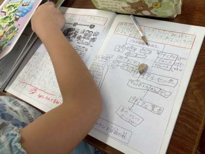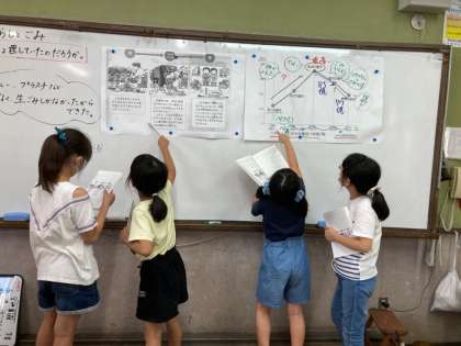 昨日は,くらしとごみのまとめをしました。ごみが家庭から出てから,エコランド音羽の杜までに着くまでのごみの流れをステップチャートにまとめました。燃やすごみと資源ごみはそれぞれクリーンセンターとリサイクルセンターに行くこと。それから,その後どうなるかをみんなで話し合いました。
