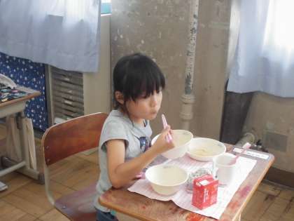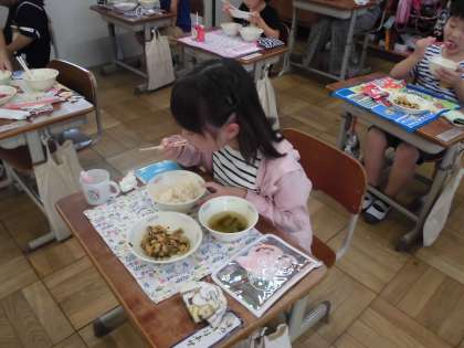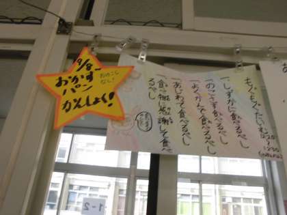 4じかめのおわりになると「おなかがへってきたなあ。」「いいにおいがする。」というこえがきこえてきます。マナーをまもって,のこさずいただくことができたらとおもっています。クラスみんなでごはんやパンばこ,しょっかんがからになったひは,きねんにほしがかがやきます。1ねんせいはきゅうしょくもいっしょうけんめいです。
