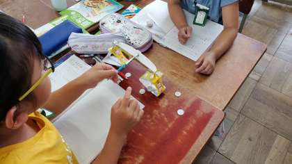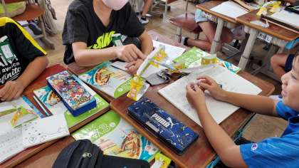 算数では重さの学習が始まりました。ものの重さを比べるためにてんびんを使いました。左右の皿に様々な文房具を乗せて,てんびんの傾きを調べました。また,文房具の重さが1円玉何枚分の重さなのかを調べ,1円玉1枚の重さが1g(グラム)という新しい単位を知りました。子どもたちからは,