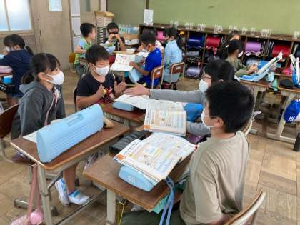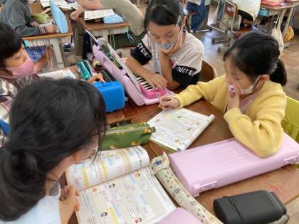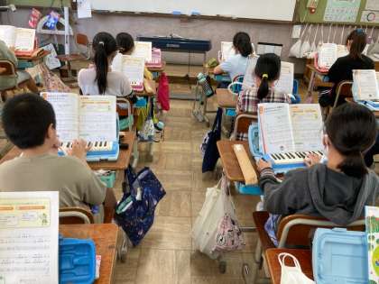 4文字の言葉と,それをもとにした3つのリズムを使って,リズムアンサンブルをグループでやりました。「よびかけと答え」や「反復」という音楽用語を学習し,交互に手拍子したり,リズムを繰り返したりしながら,みんなで工夫しながら作りました。今度の授業でそれぞれのグループごとに発表してもらいます。楽しみですね。